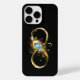 Gold, shiny symbol of infinity, decorated with jewelry peacock feather with turquoise on black background.