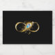 Gold, shiny symbol of infinity, decorated with jewelry peacock feather with turquoise on black background.