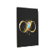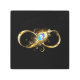 Gold, shiny symbol of infinity, decorated with jewelry peacock feather with turquoise on black background.