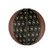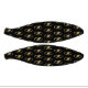 Gold, shiny symbol of infinity, decorated with jewelry peacock feather with turquoise on black background.
