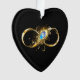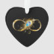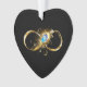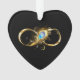 Gold, shiny symbol of infinity, decorated with jewelry peacock feather with turquoise on black background.