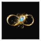 Gold, shiny symbol of infinity, decorated with jewelry peacock feather with turquoise on black background.