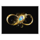 Gold, shiny symbol of infinity, decorated with jewelry peacock feather with turquoise on black background.
