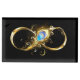 Gold, shiny symbol of infinity, decorated with jewelry peacock feather with turquoise on black background.