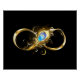 Gold, shiny symbol of infinity, decorated with jewelry peacock feather with turquoise on black background.