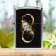 Gold, shiny symbol of infinity, decorated with jewelry peacock feather with turquoise on black background.