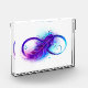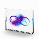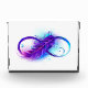 Infinity symbol with a beautiful feather painted in purple and blue bright colors on white background.