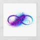Infinity symbol with a beautiful feather painted in purple and blue bright colors on white background.