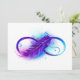 Infinity symbol with a beautiful feather painted in purple and blue bright colors on white background.