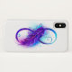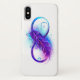 Infinity symbol with a beautiful feather painted in purple and blue bright colors on white background.