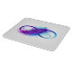 Infinity symbol with a beautiful feather painted in purple and blue bright colors on white background.
