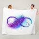 Infinity symbol with a beautiful feather painted in purple and blue bright colors on white background.