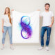 Infinity symbol with a beautiful feather painted in purple and blue bright colors on white background.