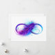 Infinity symbol with a beautiful feather painted in purple and blue bright colors on white background.