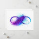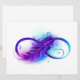 Infinity symbol with a beautiful feather painted in purple and blue bright colors on white background.