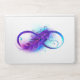 Infinity symbol with a beautiful feather painted in purple and blue bright colors on white background.