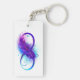 Infinity symbol with a beautiful feather painted in purple and blue bright colors on white background.