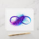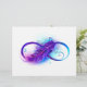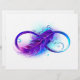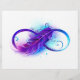 Infinity symbol with a beautiful feather painted in purple and blue bright colors on white background.