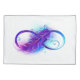 Infinity symbol with a beautiful feather painted in purple and blue bright colors on white background.