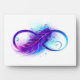 Infinity symbol with a beautiful feather painted in purple and blue bright colors on white background.