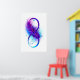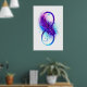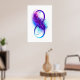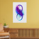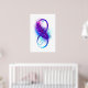 Infinity symbol with a beautiful feather painted in purple and blue bright colors on white background.