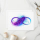 Infinity symbol with a beautiful feather painted in purple and blue bright colors on white background.
