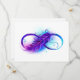 Infinity symbol with a beautiful feather painted in purple and blue bright colors on white background.