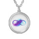 Infinity symbol with a beautiful feather painted in purple and blue bright colors on white background.