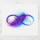 Infinity symbol with a beautiful feather painted in purple and blue bright colors on white background.