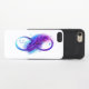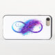 Infinity symbol with a beautiful feather painted in purple and blue bright colors on white background.
