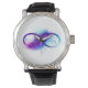 Infinity symbol with a beautiful feather painted in purple and blue bright colors on white background.