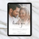 Informal Script Photo Engagement Thank You. A modern design to say thanks after your engagement party, with elegant set script with heart swashes for Thank you, beneath your photo at the top and the rest of the text you can easily personalize. Choose a photo of you both and replace the sample photo in the template placeholder with it.