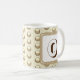 This monogram mug is a great way to add a personal touch to your morning tea or coffee. A gold polka dot pattern appears against a beige background. The letter "O" is featured in a square along and can quickly and easily be personalized.