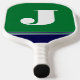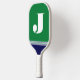 This monogrammed pickleball paddle is simple, modern, minimal but bold and colorful with its green and navy blue stripes and your first or last initial in white.