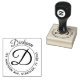 This personalised, round, return address rubber stamp has a sample last name and return address in a calligraphy style font in a circle. The first initial of the last name is in the center of the circle, as a script monogram.