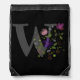 Design features Monogram plus Flowers in a Floral Design. Initial is the letter W. Black drawstring backpack bag.