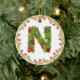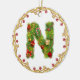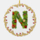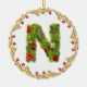 initial N monogrammed christmas ornament - circle. This exquisite letter N christmas tree decoration will give your xmas a traditional touch with a modern personalized feel. Designed to look like a fir tree covered with presents and gifts this letter a on a circular ornament is surounded by a gold frame with red berries. Upmarket and on trend this is an affordable luxury for you holiday decor needs. Double sided for extra impact this green and red image on a snowy white background is a favorite with businesses also. Full alphabet available.