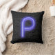 Initial P in glowing marquee purple neon lighting on urban city brick wall.