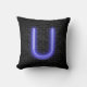 Initial U in glowing marquee purple neon lighting on urban city brick wall.
