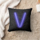Initial V in glowing marquee purple neon lighting on urban city brick wall.