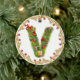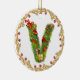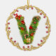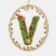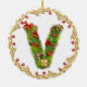 initial v monogrammed christmas ornament - circle. This exquisite letter v christmas tree decoration will give your xmas a traditional touch with a modern personalized feel. Designed to look like a fir tree covered with presents and gifts this letter a on a circular ornament is surounded by a gold frame with red berries. Upmarket and on trend this is an affordable luxury for you holiday decor needs. Double sided for extra impact this green and red image on a snowy white background is a favorite with businesses also. Full alphabet available.