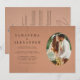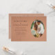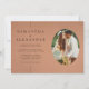 Choose this unique minimalist wedding invitation template featuring a sleek, classic lettering and one of your favorite engagement photos in an oval frame on a delicate, light terracotta floral background.