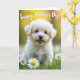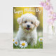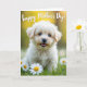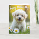 This card shows a fluffy, light-cream puppy centered in a soft-focus outdoor setting, looking straight ahead with dark, shiny eyes that feel like a gentle hello ❤️. Its small pink tongue peeks from a slightly open mouth, giving it a sweet, friendly expression, like it’s sharing a quiet moment with someone it adores. Behind the pup, the background fades into blurred greens and warm yellow light, suggesting sunlit grass and leaves without sharp details. Near the lower front edge, a few white daisies with bright yellow centers sit slightly out of focus, framing the puppy in a tender, springtime way 🌼. The phrase “happy Mother’s Day!” appears above the puppy, placed near the top center in a light-colored, flowing style that stands out against the darker green blur. Soft daylight falls across the puppy’s fur, catching fine strands along the cheeks and forehead and adding a cozy glow. The daisies cluster along the bottom foreground, with white petals angled toward the center and yellow centers dotted like small coins.