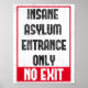 Insane Asylum-Entrance Only-No Exit Funny Poster