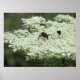 On a hot summer morning in Corfu, a cute red and black insect lands on the frothy, creamy petals of the exquisite elderflower in full bloom. This is a striking nature photo image that creates a wonderful floral design and highlights the beetle foraging for food on the flower.