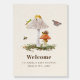 Nature storybook page inspired baby shower welcome featuring illustration of two mushrooms surrounded by moth, bee, grasshopper, and snail.