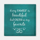 Inspirational Family Quote Gifts and Decor. Chic teal background with vintage accents, featuring the inspirational family quote, "Every family is beautiful, but ours is my favorite".