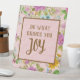 Inspirational "Do what brings you joy " quote on pink and white polka dot background with pink and purple floral frame.