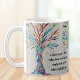 This decorative coffee mug features a rainbow-colored mosaic tree and an inspiring quote.