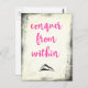 A postcard with a motivating strength-inspiring quotation to uplift and encourage which says: "conquer from within". The background is a yellowish grunge background with black worn looking corners. A sketch of a mountain at the bottom, to signify the struggle, the journey and ones ultimate success. I like the contrast of cute and girly typography with a rough edgy looking background. I hope you enjoy it too. Thanks for looking.